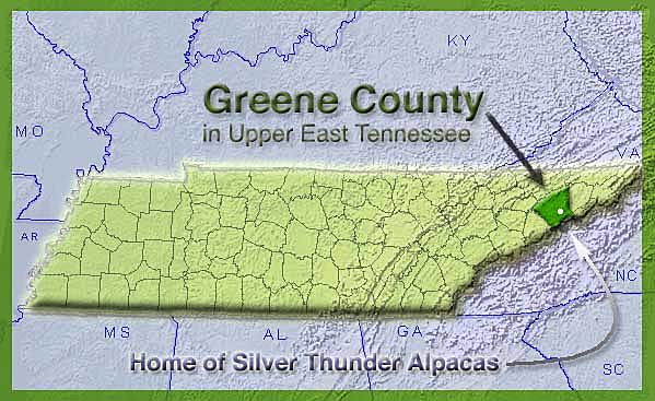 This map shows where Silver Thunder Alpacas has made it's new home on the eastern edge of Tennessee..